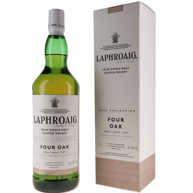 Laphroaig Four Oak je, što možda i nije iznenađujuće, mješavina viskija koji sazrijeva u četiri različite vrste bačvi: ex-bourbon bačve, male četvrt bačve, djevičanske bačve od američkog hrasta i bačve od europskog hrasta.